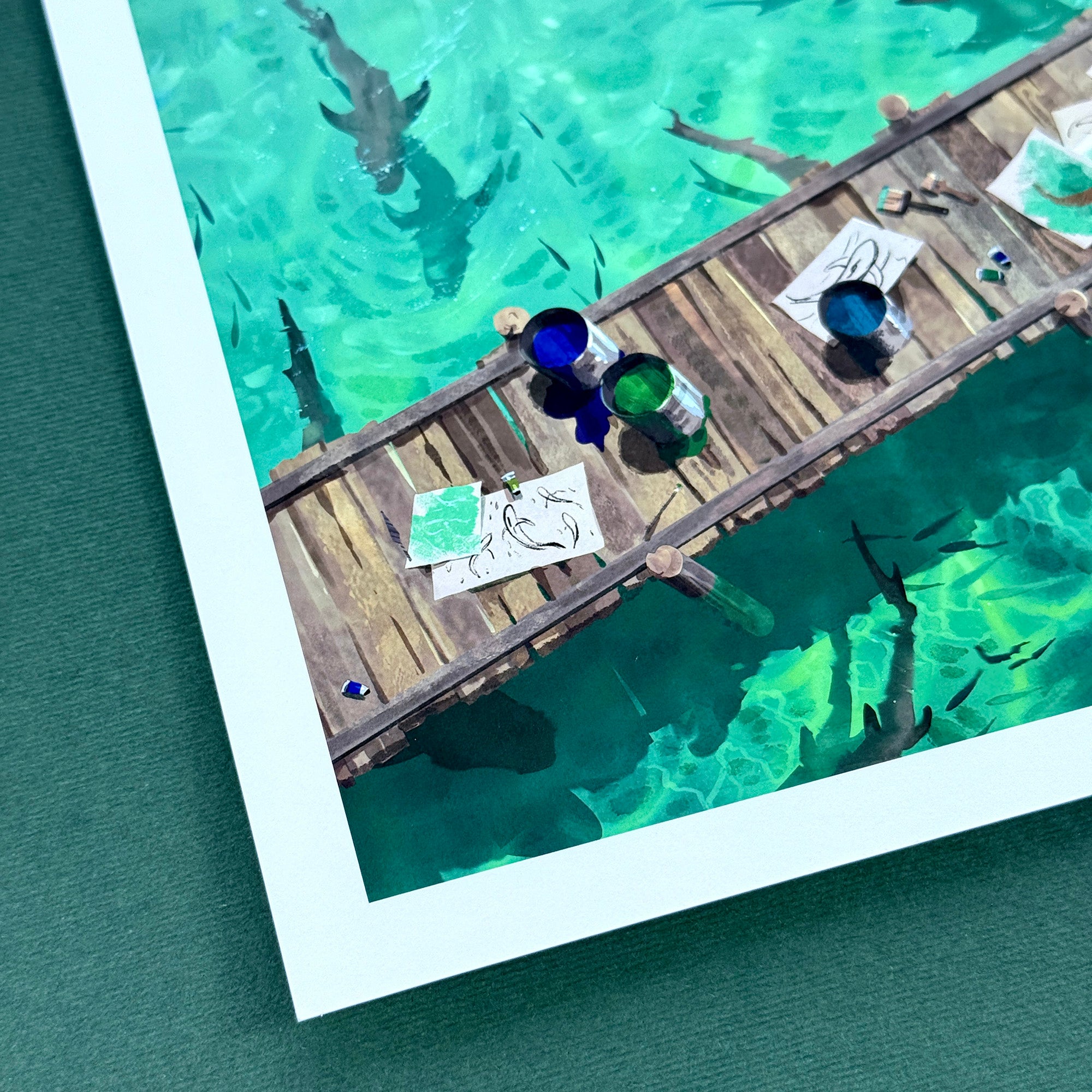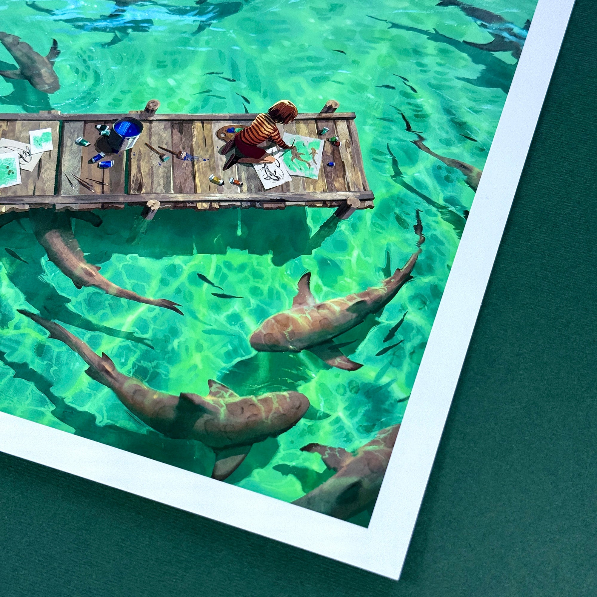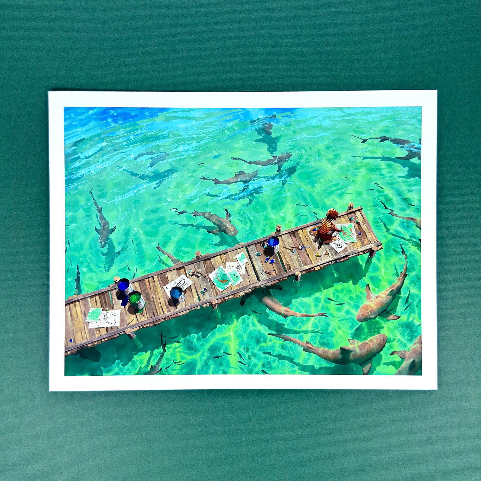 This art print of 'Painting The Shark' by Devin Elle Kurtz is available in your choice of two sizes, printed on 100% cotton 190gsm natural paper and part of the Holiday Prints Collection available to order now for a limited time only.