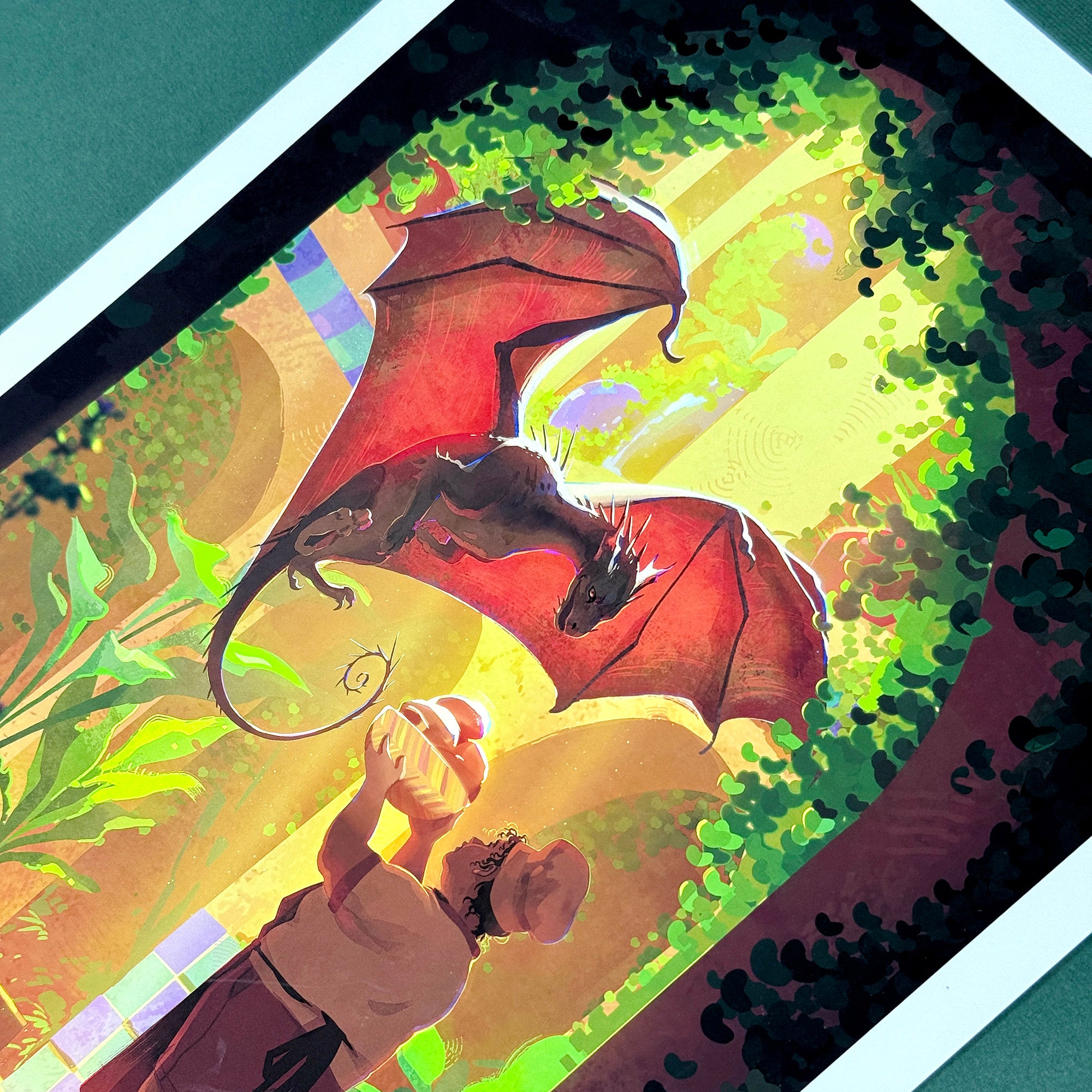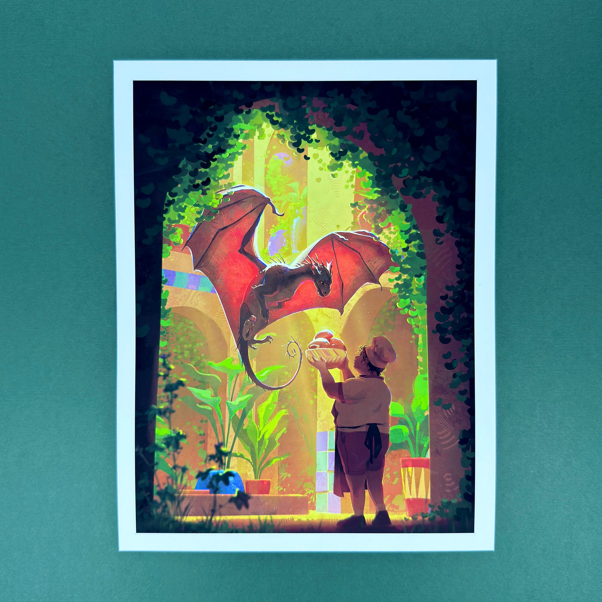 This art print of 'The Bakers Dragon' by Devin Elle Kurtz is available in your choice of two sizes, printed on 100% cotton 190gsm natural paper and part of the Holiday Prints Collection available to order now for a limited time only.