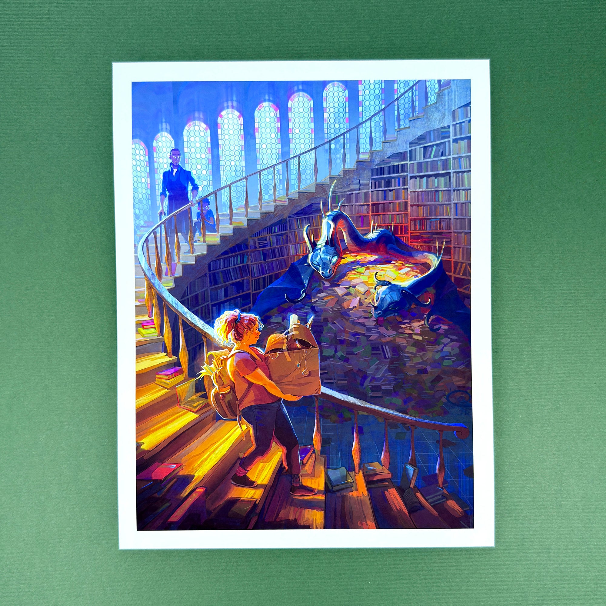 This art print of 'The Library Dragon' by Devin Elle Kurtz is available in your choice of two sizes, printed on 100% cotton 190gsm natural paper and part of the Holiday Prints Collection available to order now for a limited time only.